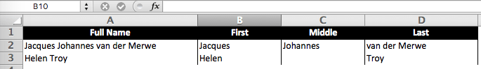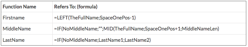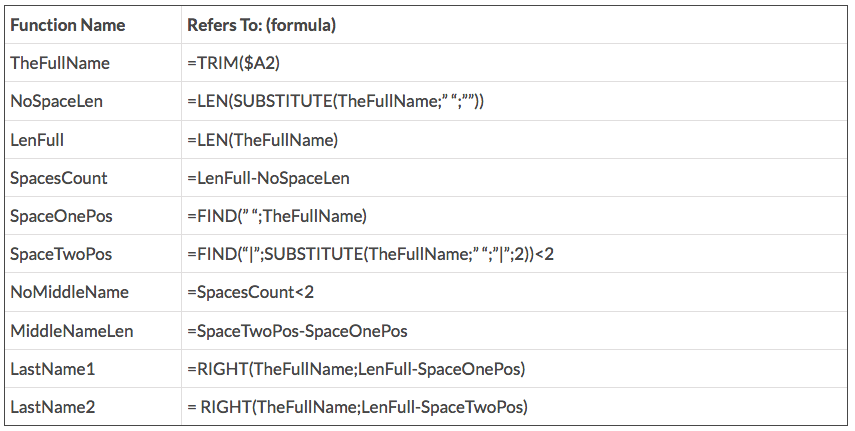 In a column of full names containing first, middle and last names, Excel’s Text-To-Columnsfunction fails with last names like “van der Merwe”. To get around this, using Names Manager, we’ll create our own text functions standing on the broad shoulders of some text functions already available in Excel: FIND, LEFT, LEN, MID, RIGHT, SUBSTITUTE, against a full name in cell $A2: